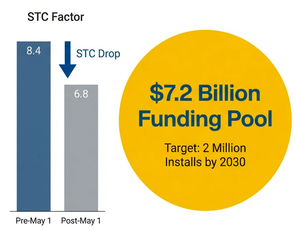 The upcoming restructure of the federal battery rebate on May 1 is designed to align incentives with right sized systems. While the STC factor will shift from 8.4 to 6.8, the government has expanded funding to $7.2 billion to support over 2 million installations by 2030.